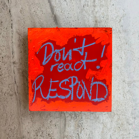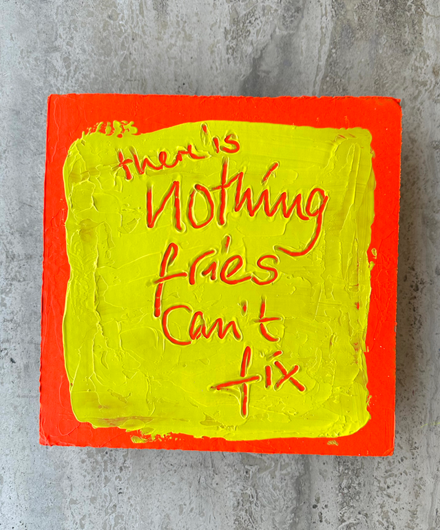 Stephanie Kruses farbintensive „Friendly Reminder“ sind übergroße Post-Its aus 6 cm dicker Wabenpappe – ein Material, das gleichzeitig alltäglich und außergewöhnlich wirkt. Kruse überzieht es mit intensiven Kontrasten, ritzt Worte hinein oder setzt sie mit Ölkreide, und schafft so berührende Erinnerungen, die uns aus dem Kopfnebel der stetigen Gedanken direkt ins Hier und Jetzt holen.